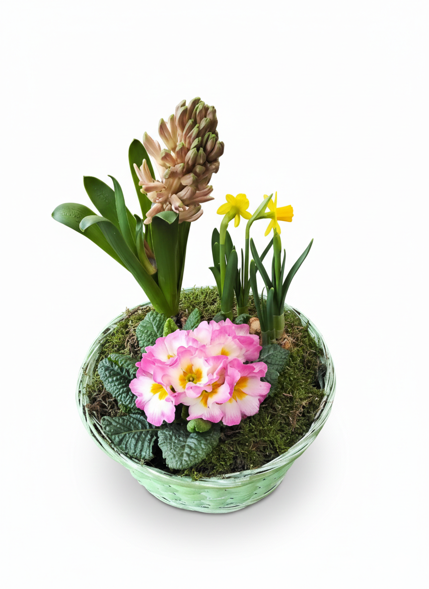 Frühlingskorb mit 3 Pflanzen gesetzt in verschiedernen Farben erhältlich, Farben können je nach Lagerung variieren