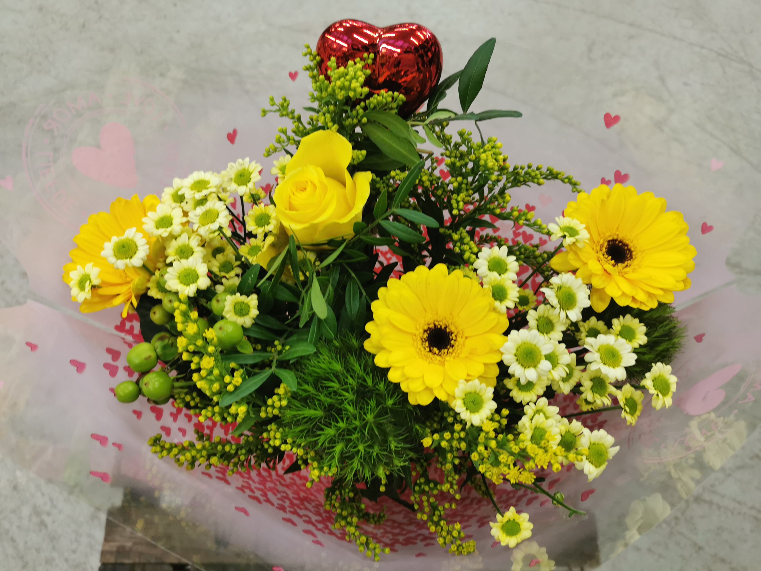 / Bundstrauß in gelb mit Herz ( je nach Lagerung können Blumen und Farben variieren)