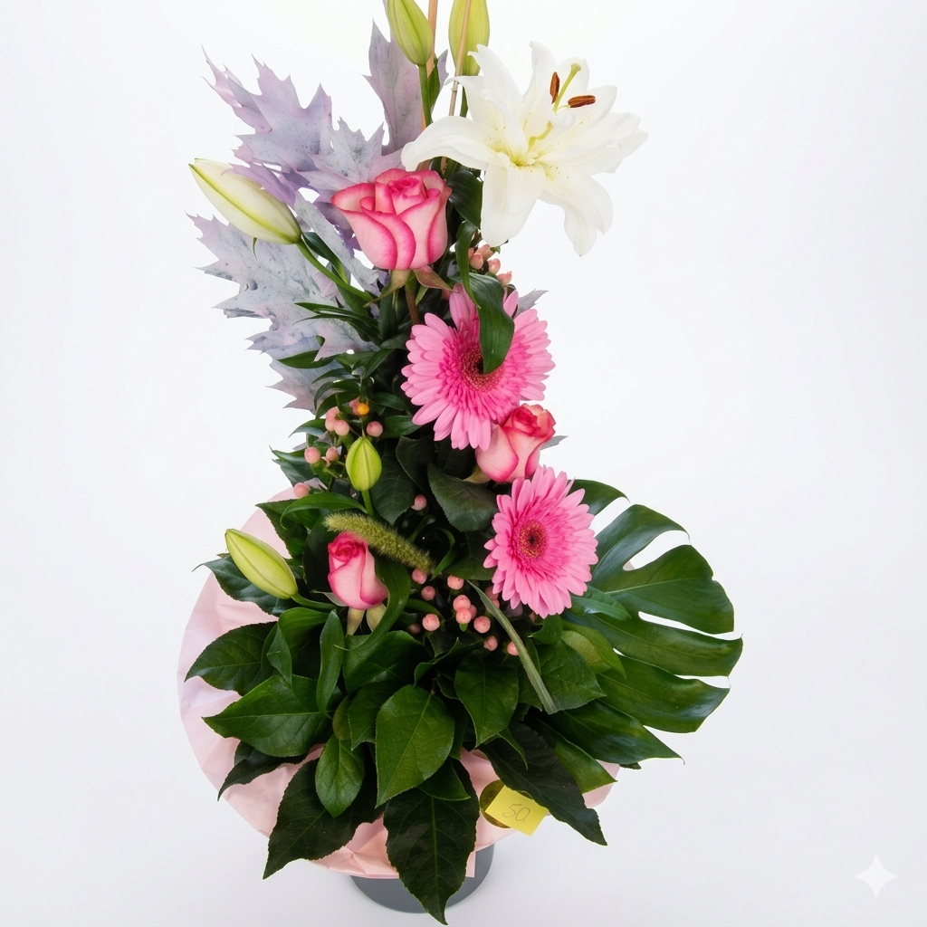 Hochgebundener Blumenstrauß in der Farbe pink  mit gemischten Blumen der Saison mit manchette. Beispiel Foto mit Lilien, Gerbera und Rosen.